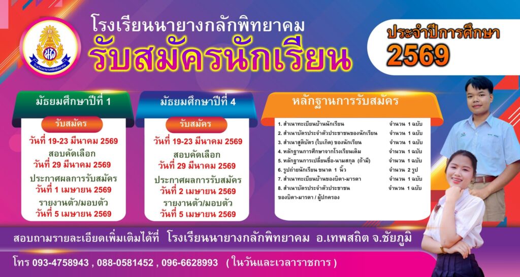 ประกาศรายชื่อผู้มีสิทธิ์สอบ ชั้นมัธยมศึกษาปีที่ 1 และชั้นมัธยมศึกษาปีที่ 4 ปีการศึกษา 2569 โรงเรียนนายางกลักพิทยาคม
